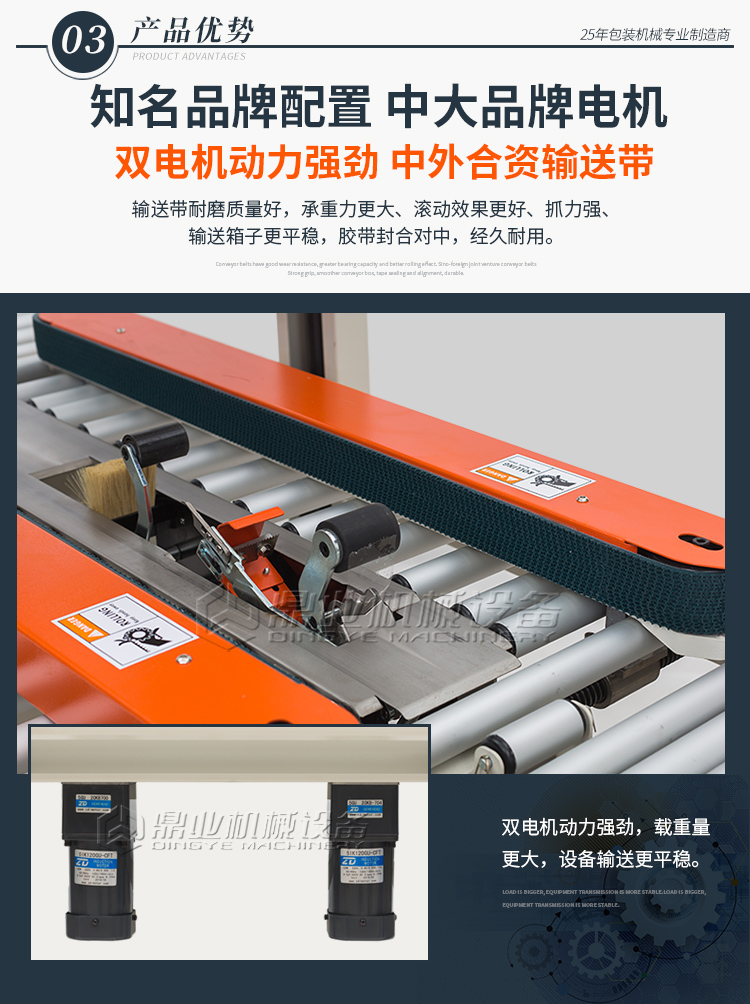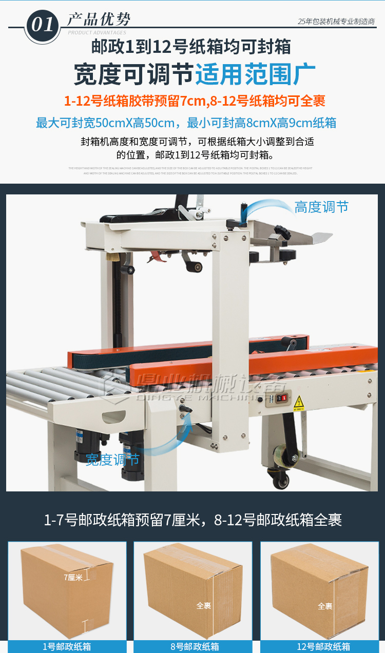 鼎業(yè)FXC5050XG郵政小紙箱全自動封箱打包機全可根據(jù)不同紙箱規(guī)格,自動調(diào)節(jié)寬度及高度,操作方便、簡單、快速。上下一字型全自動封箱,自動化程度高;單機作業(yè),適合小批量、多規(guī)格生產(chǎn)使用。采用即貼膠帶封口,封箱效果平整、規(guī)范、美觀;也可以采用印字膠帶,更可提高產(chǎn)品形象。
