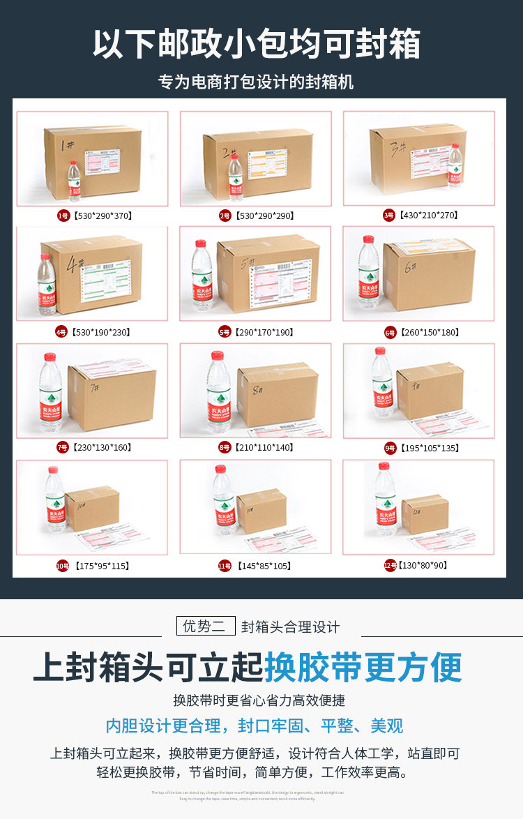 專門為電商行業(yè)設(shè)計(jì)研發(fā),郵政紙箱1號(hào)-12號(hào)都能適用。不用調(diào)整機(jī)器就可以打包,該機(jī)屬機(jī)械式結(jié)構(gòu),部分采用進(jìn)口零件,后刀刃穩(wěn)定可靠,調(diào)整方便等特點(diǎn)。