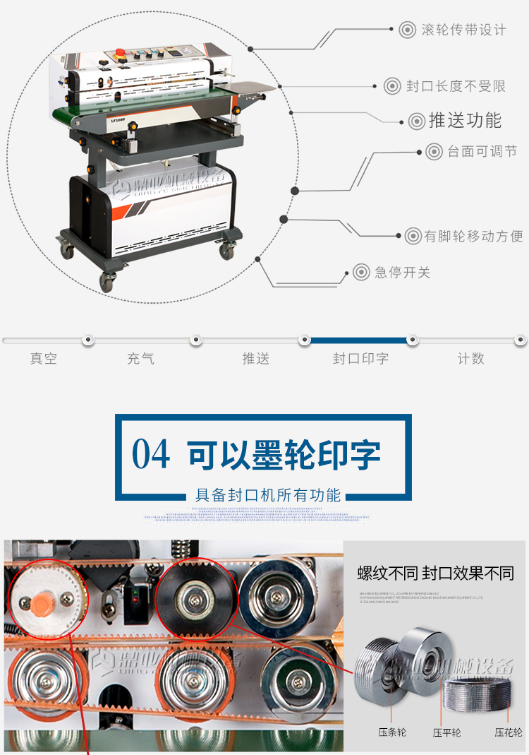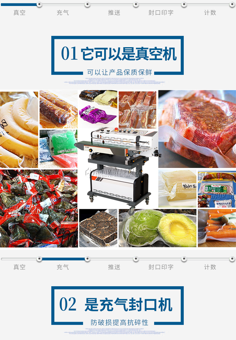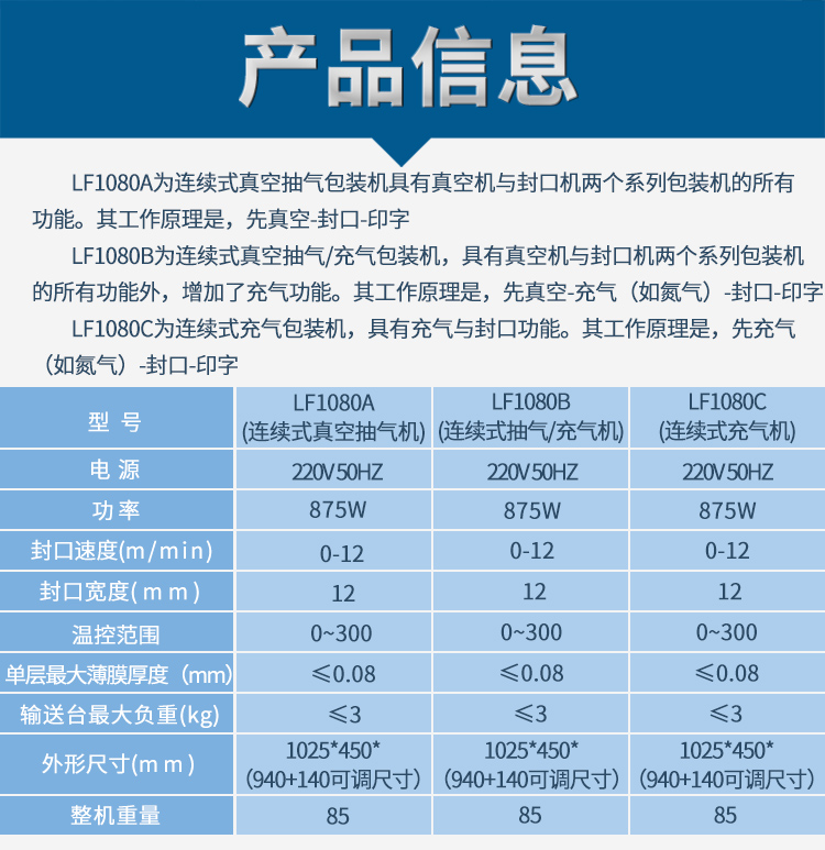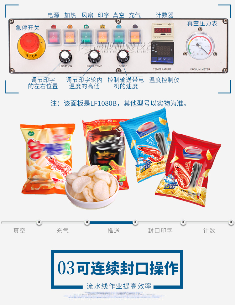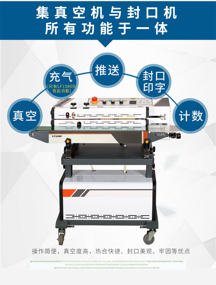 LF1080系列連續(xù)式真空抽氣/充氣封口機。是本公司在廣泛吸取國外同類產(chǎn)品和真空機之精華的基礎(chǔ)上研制的專利產(chǎn)品,該產(chǎn)品是根據(jù)市場需求而設(shè)計的新一代真空、推送、封口、印字集一體的連續(xù)式包裝機,該機結(jié)構(gòu)簡單新穎,外觀美麗時尚、功能齊全,自動化程度高,能大幅度減輕操作人員的勞動強度。具有安全可靠,操作簡便,真空度高,熱合快捷封口美觀、牢固等優(yōu)點。